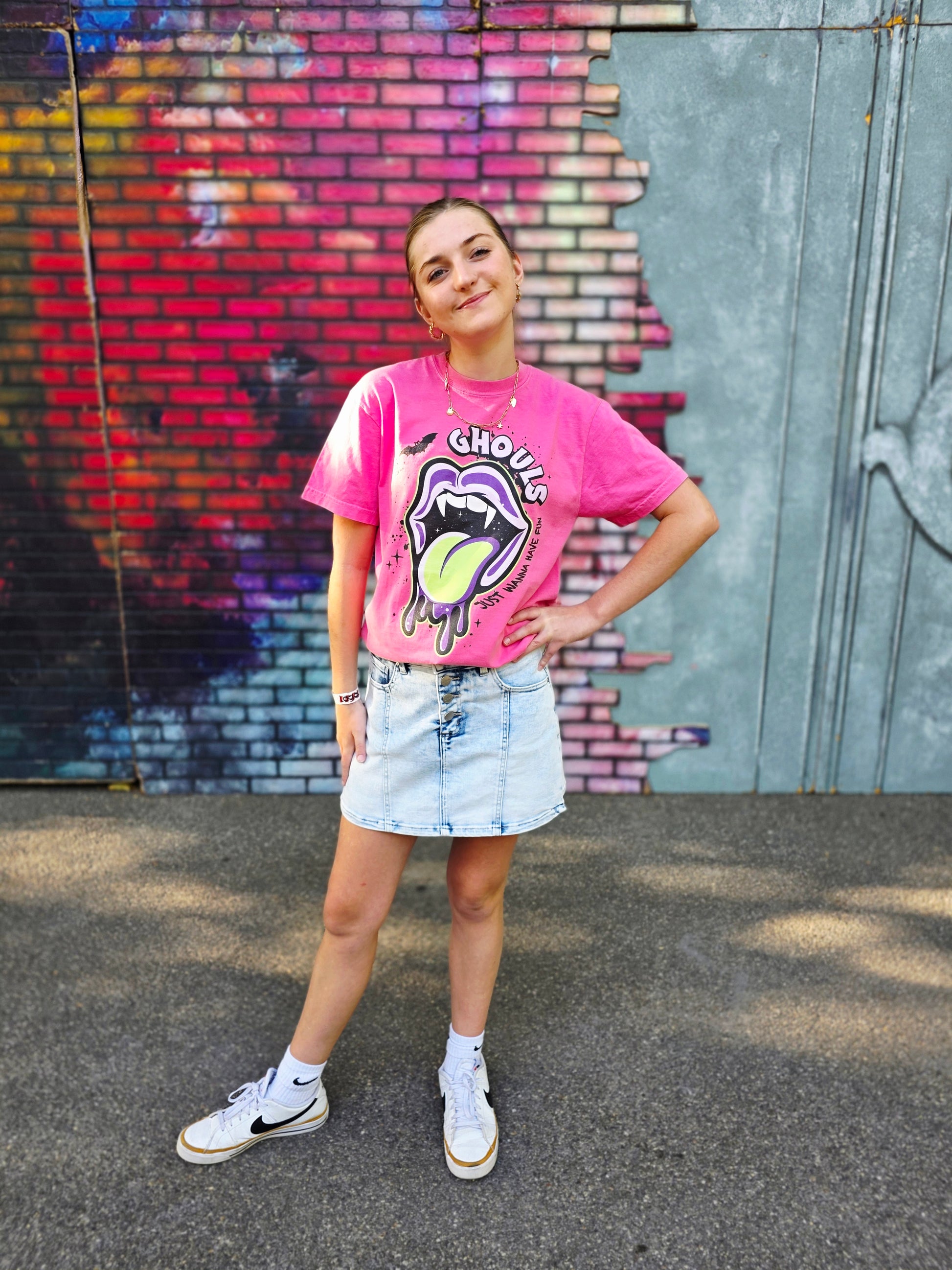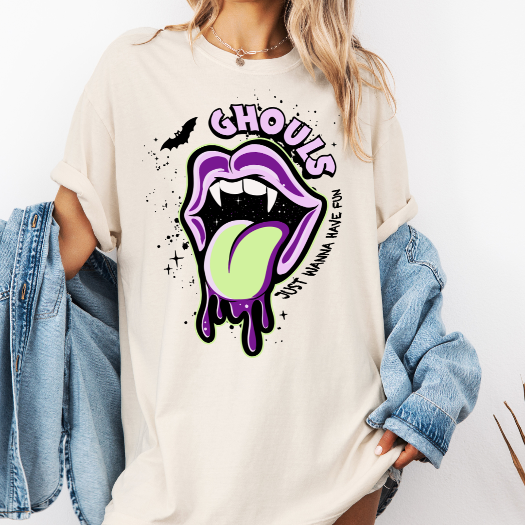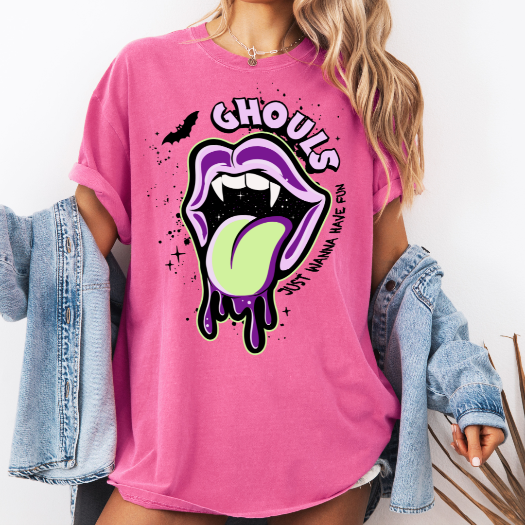 Turn heads this spooky season with our “Ghouls Just Wanna Have Fun” tee! This bold pink graphic shirt features neon green vampire lips and dripping tongue art for the ultimate spooky-cute vibe. Perfect for Halloween parties or matching with your ghoul gang.