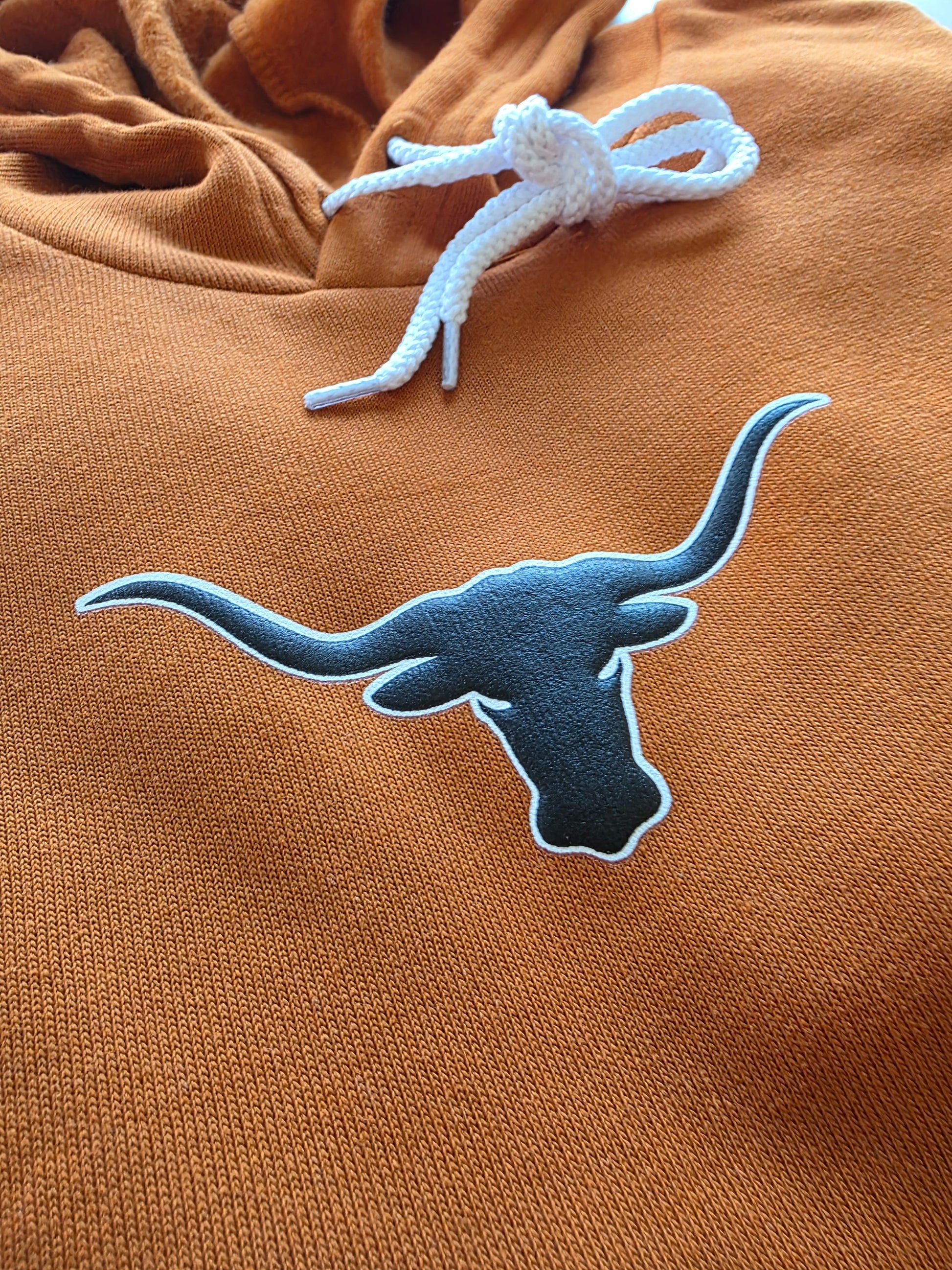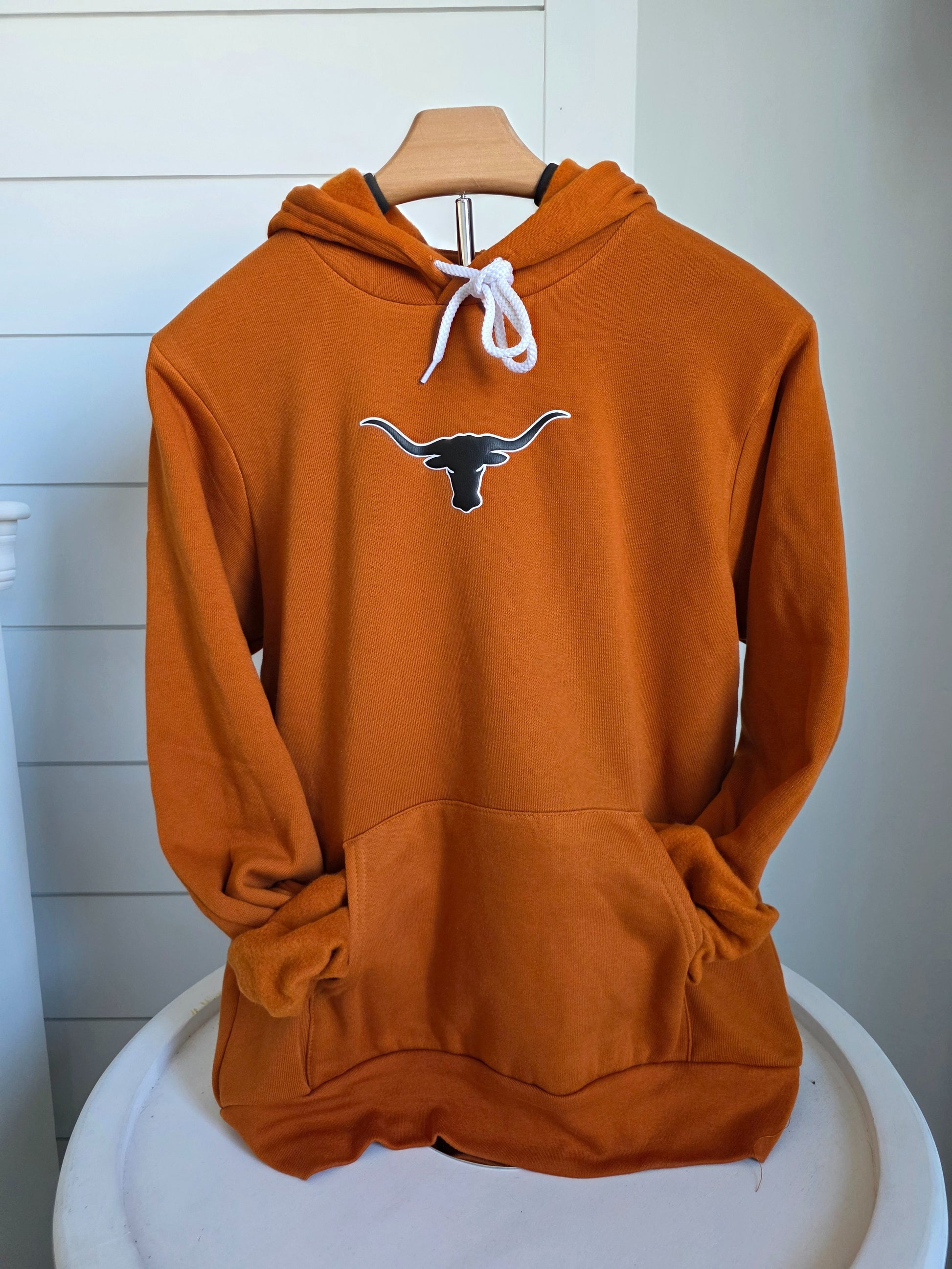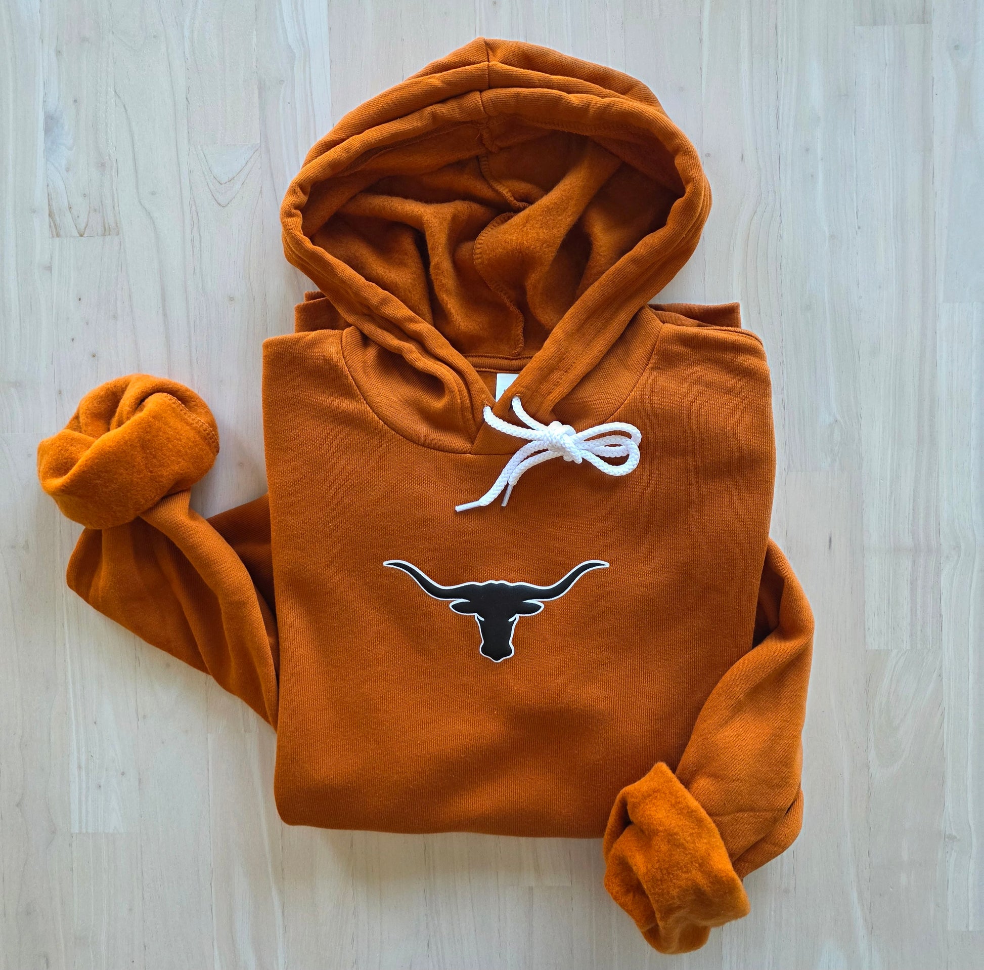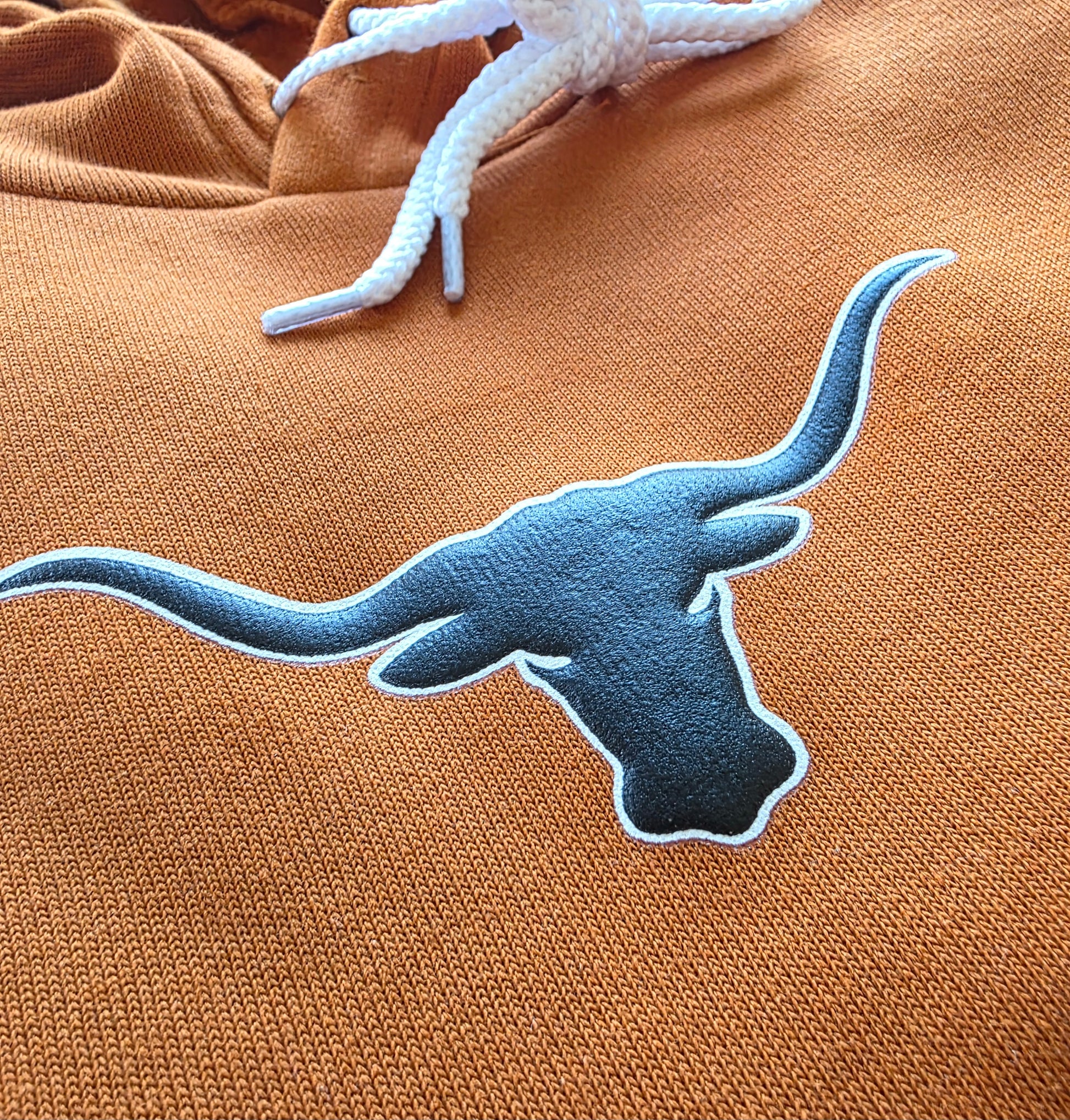 Celebrate the Longhorns in this soft Sponge Fleece Burnt Orange Hoodie with the coolest Puff Ink Longhorn, or go a little thicker and get the Box fit 10 oz Cozy Hoodie!