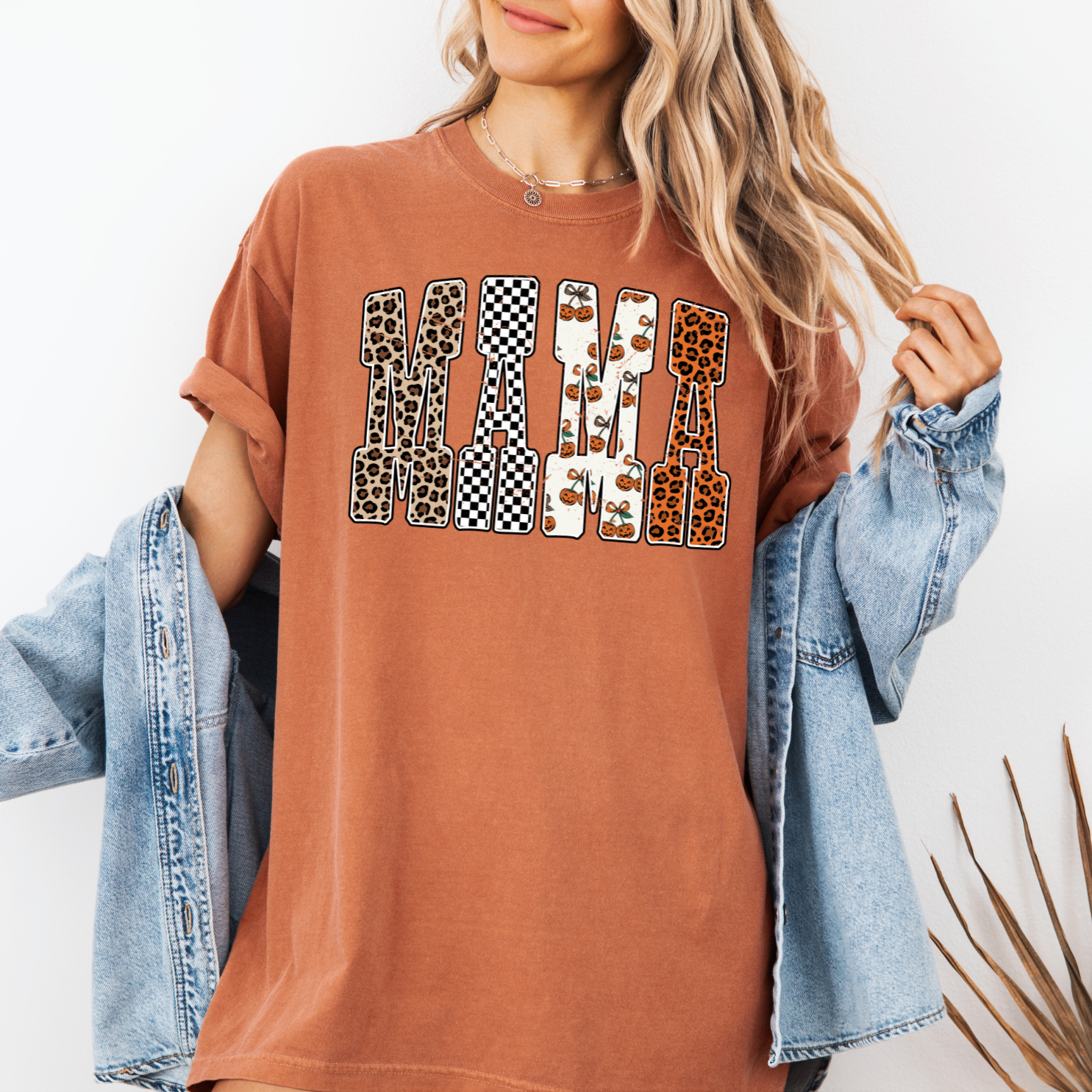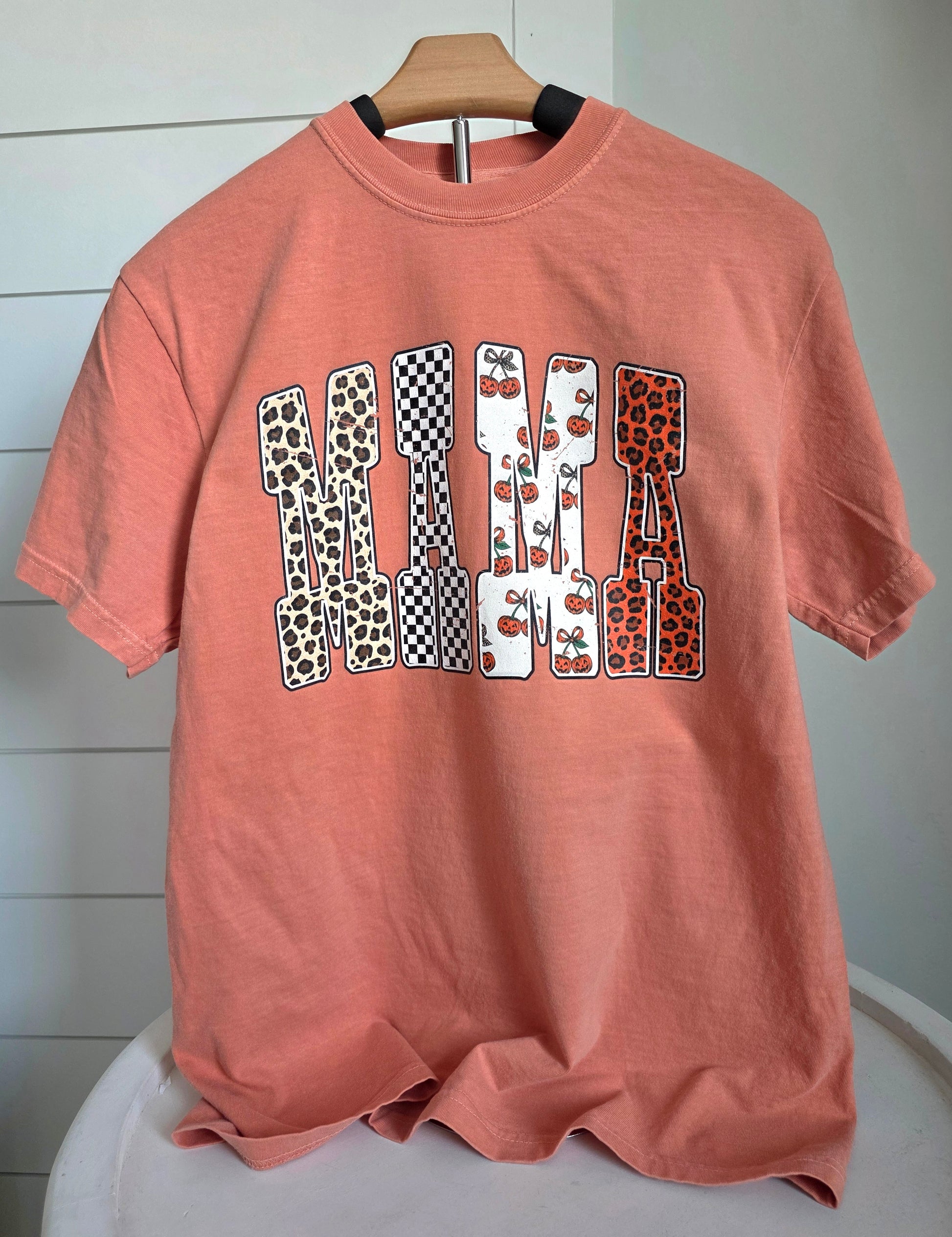 Calling all festive mamas! This Fall Mama Tee features a playful block letter design filled with autumn prints like leopard, pumpkins, florals, and checkers. Made for stylish moms who love cozy vibes, pumpkin spice, and crisp fall days.