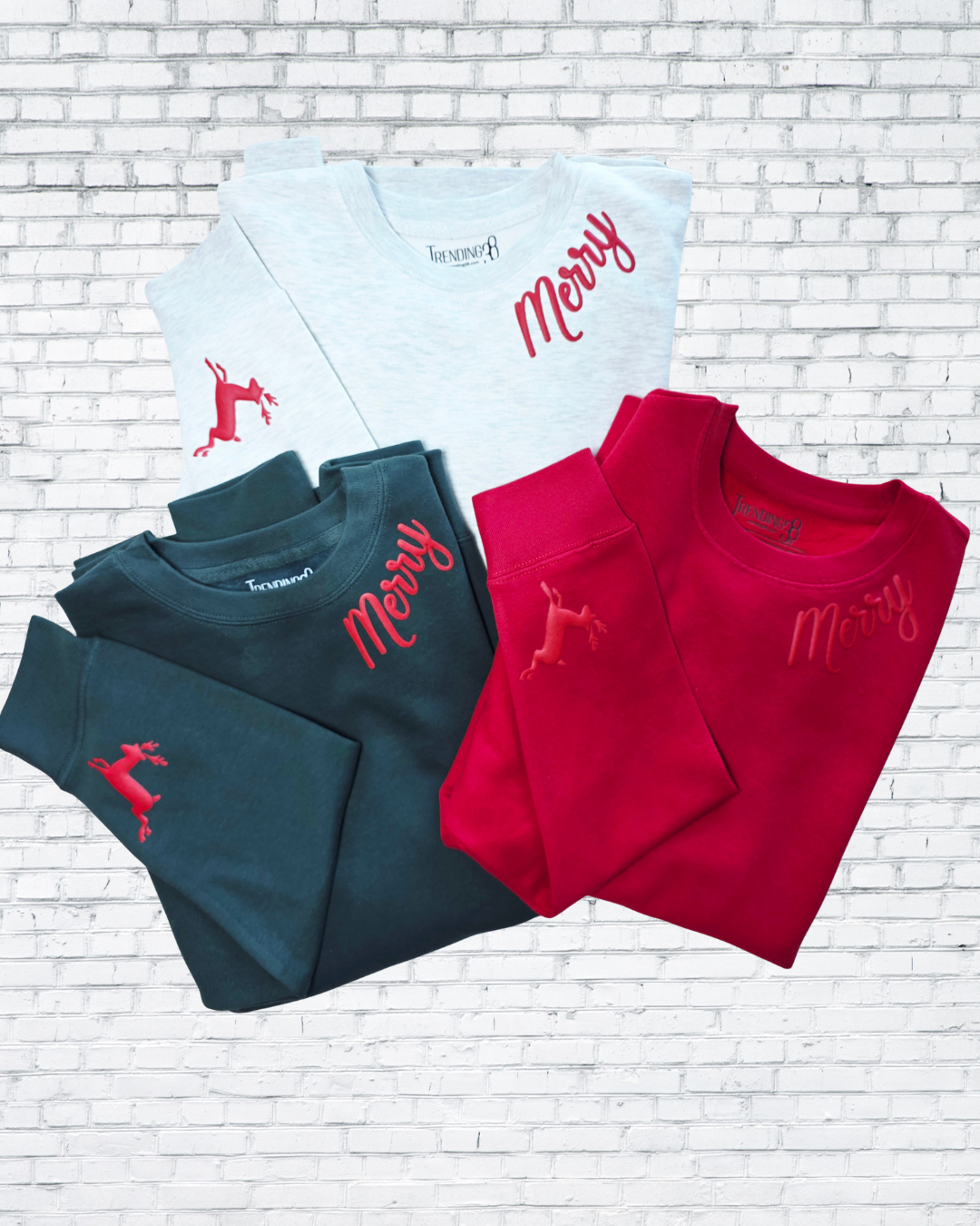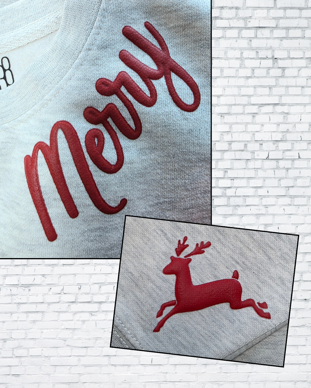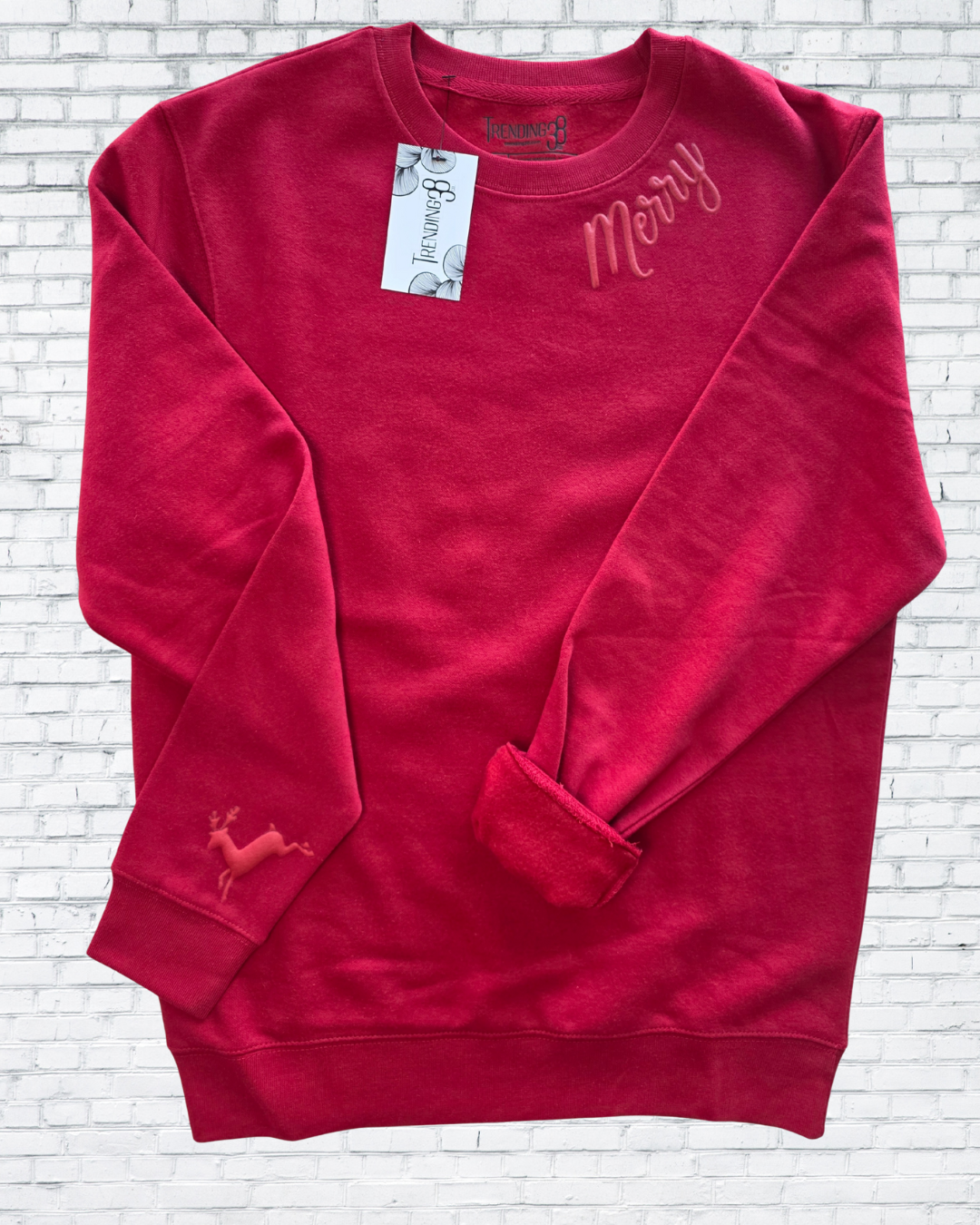 Keep your holiday style playful and festive with our Merry Puff Print Reindeer Sleeve Sweatshirt. This cozy Christmas crewneck features a raised puff print “Merry” script on the chest and an adorable puff reindeer graphic on the sleeve, giving it the perfect touch of whimsical, boutique-style charm.