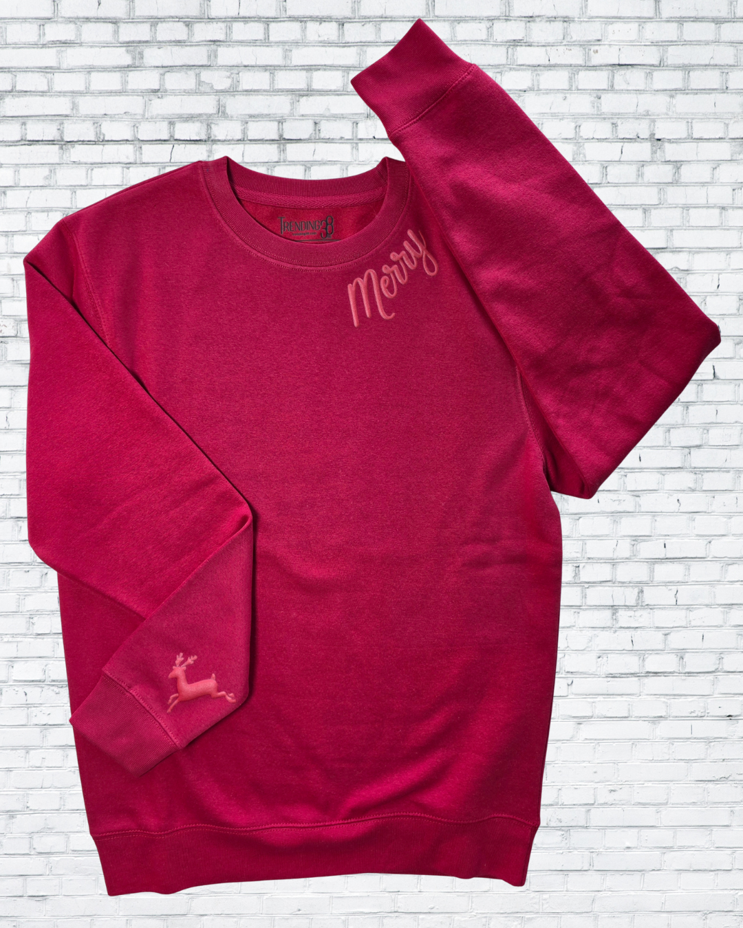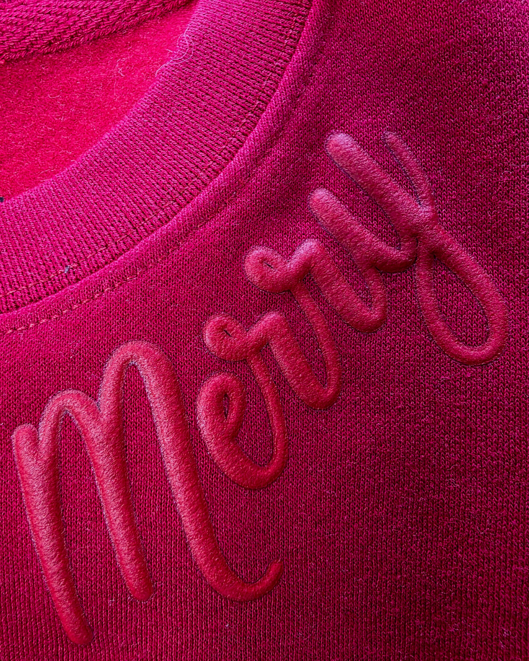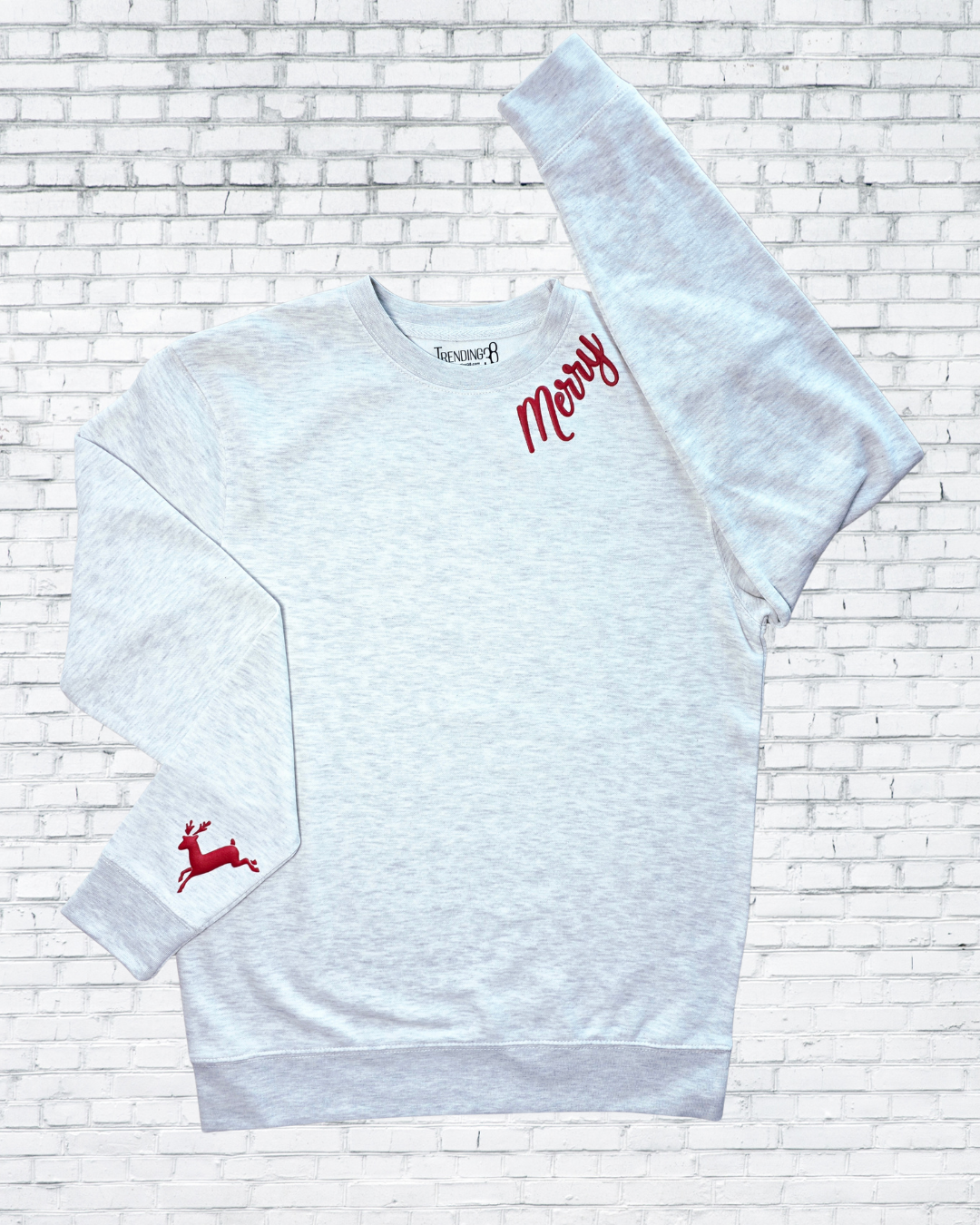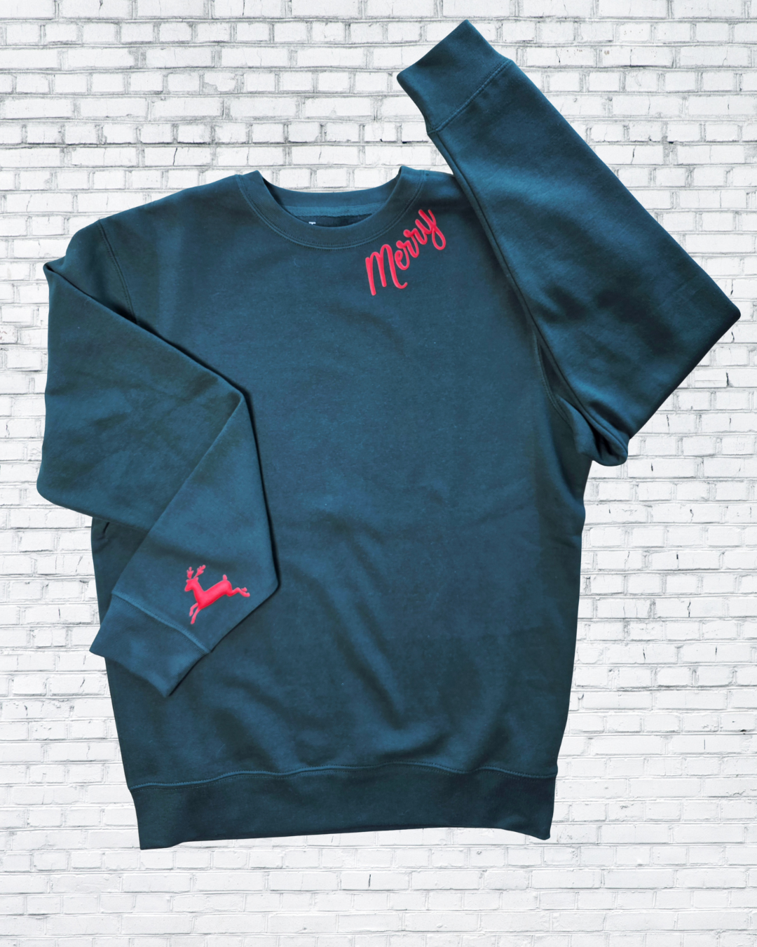 Keep your holiday style playful and festive with our Merry Puff Print Reindeer Sleeve Sweatshirt. This cozy Christmas crewneck features a raised puff print “Merry” script on the chest and an adorable puff reindeer graphic on the sleeve, giving it the perfect touch of whimsical, boutique-style charm.