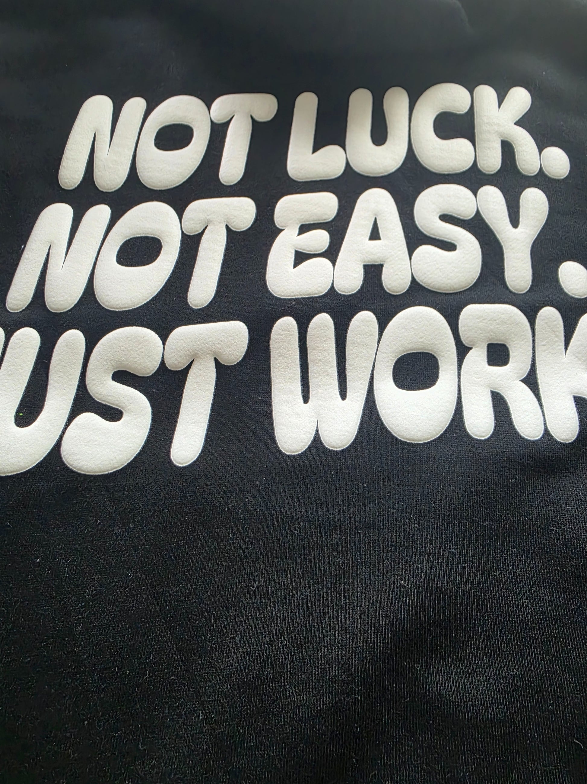 Crafted from 10oz heavyweight fabric, this hoodie offers a premium feel with warmth and structure. The bold statement “Not Luck. Not Easy. Just Work.” is printed in raised white puff ink across the chest, giving it a textured 3D look that stands out from the rest.