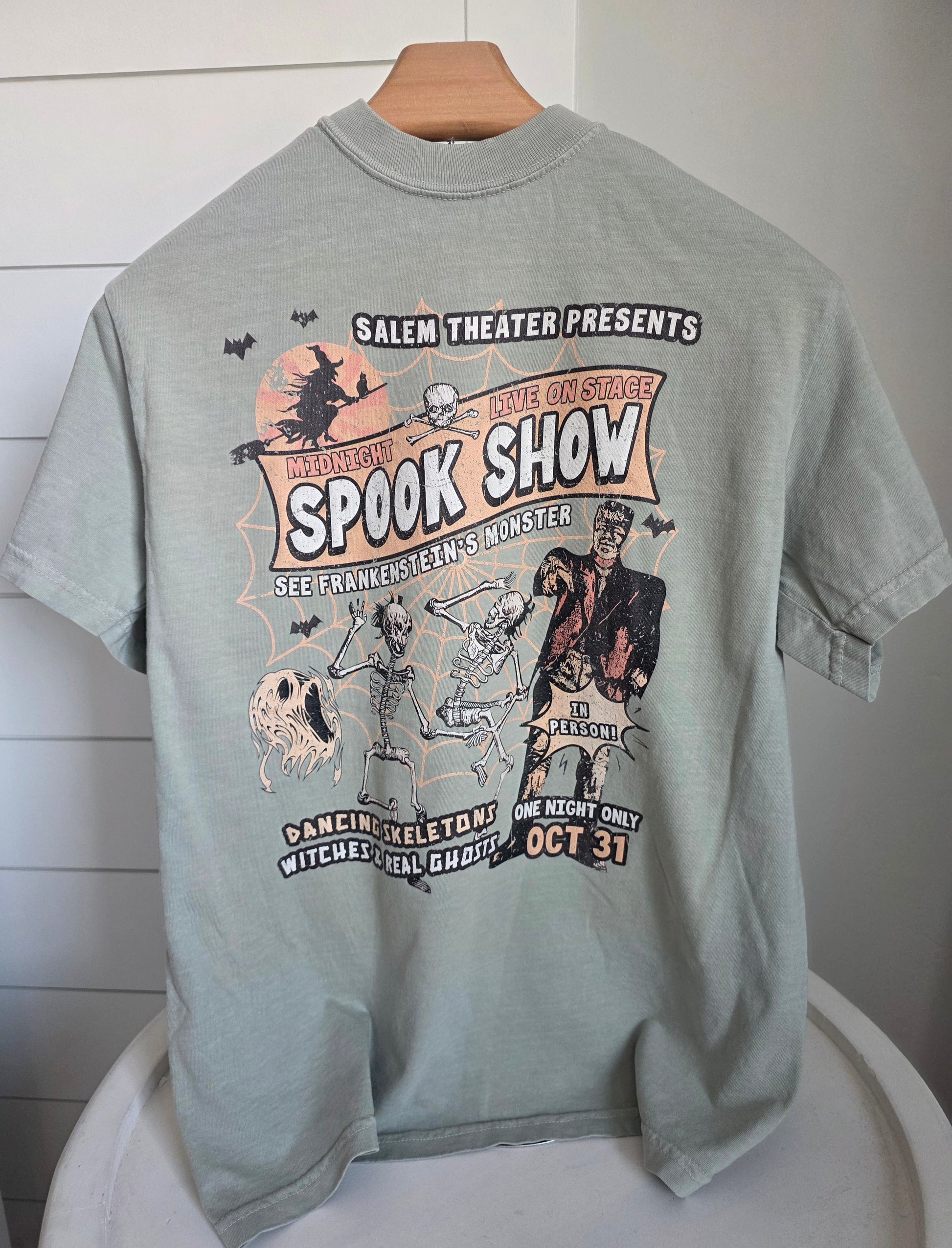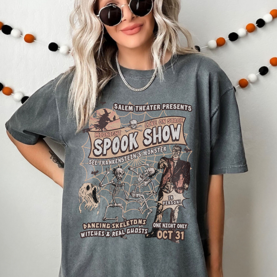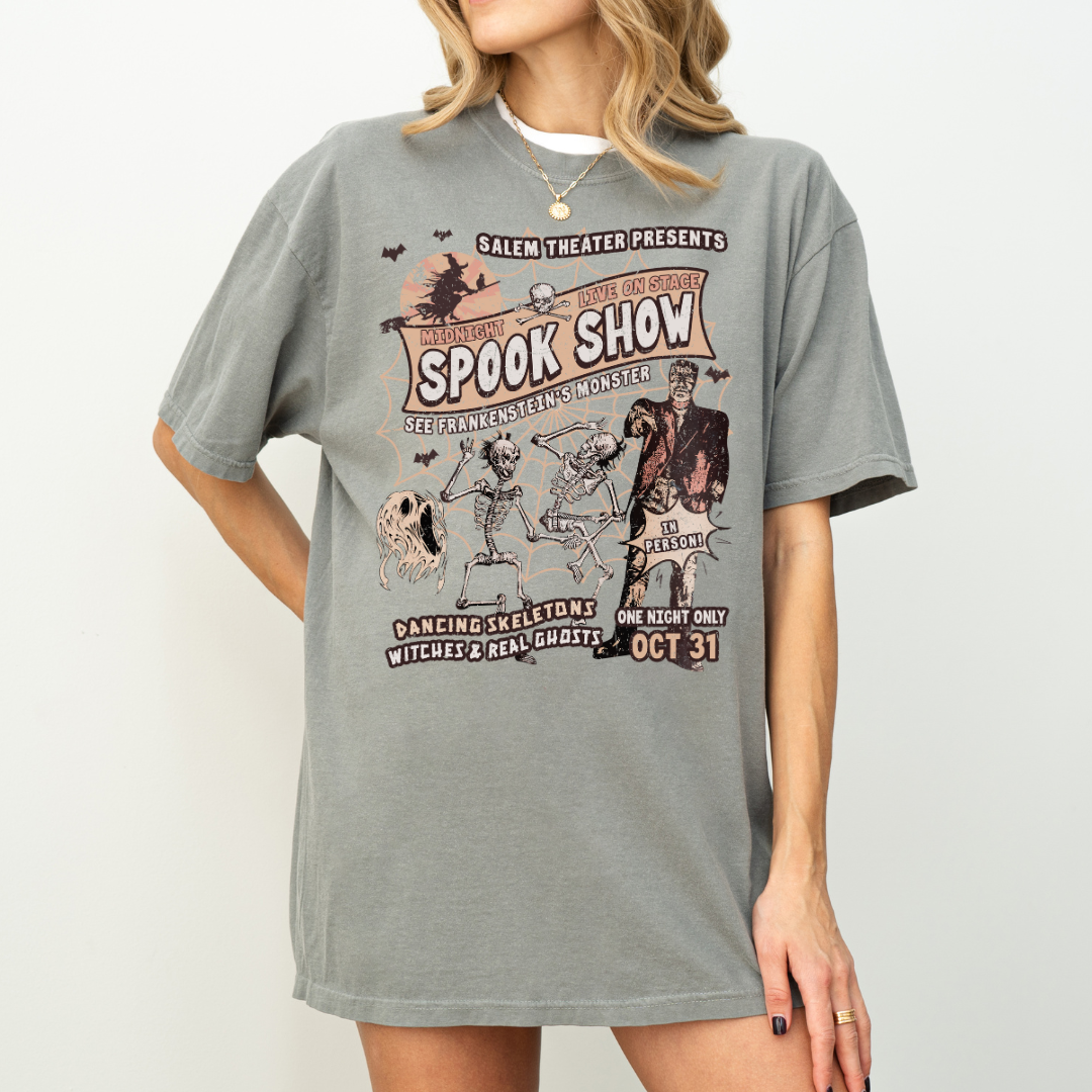 Channel old-school Halloween horror with our Vintage Spook Show Tee! Designed like a haunted 1950s movie poster, this graphic tee features Frankenstein, skeletons, witches, and creepy October 31st vibes. A must-have for retro lovers and Halloween addicts!